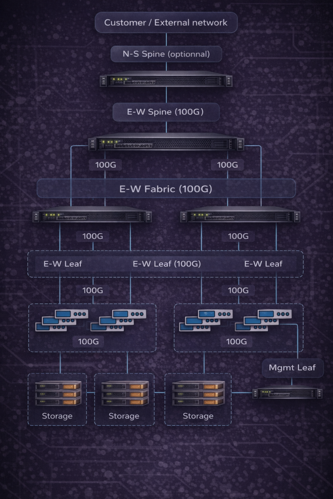 Типовые параметры: 100 / 200 / 400G • low latency • масштабируемая fabric-архитектура